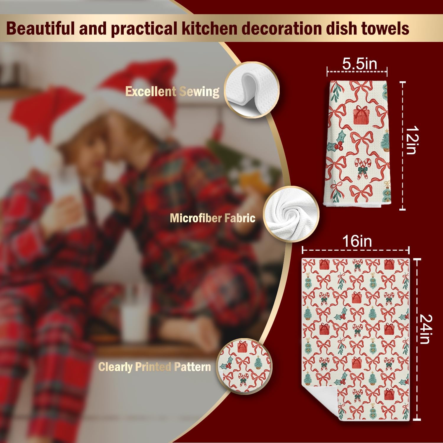 Christmas Kitchen Towels,Red and Green Christmas Bow Tree Candy Canes Decorative Dish Towels Tea Towels for Kitchen,Christmas Hand Towels for Bathroom,Christmas Bathroom Decor,16x24 Inches